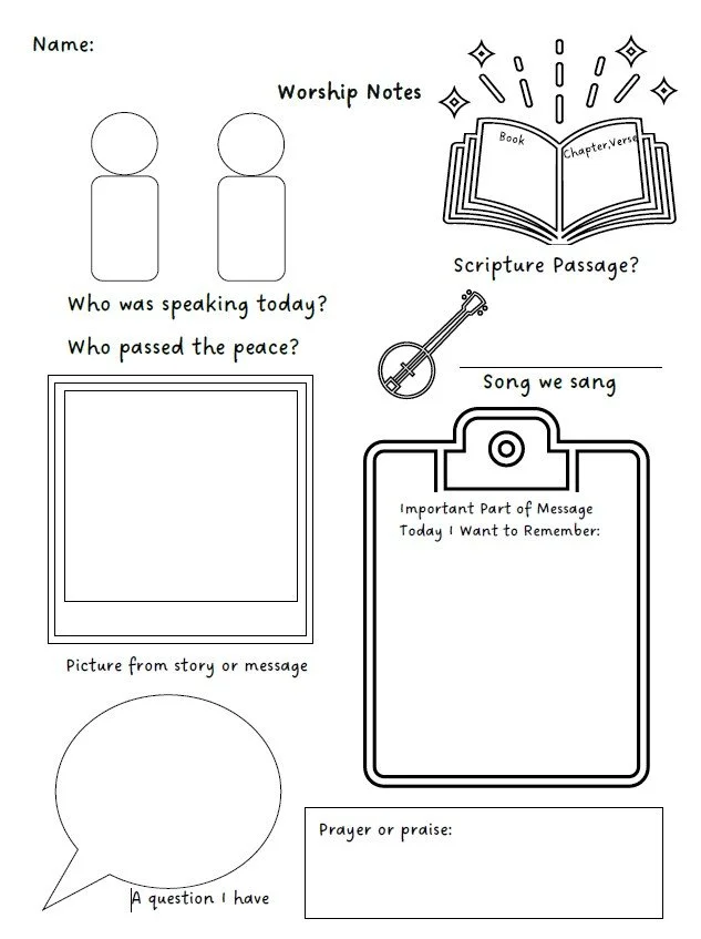 With this in mind, a first step we’re going to try is having notes to help kids learn to listen during a worship service. Depending on your kids, it might be a you do, they help, or a they do, you help, kind of activity. At Immanuel, there will be printed copies available, but I wanted to have them digitally in case you wanted to print your own (like for a binder) or edit to fit your family. You can click on the image to access the two PDFs I created.